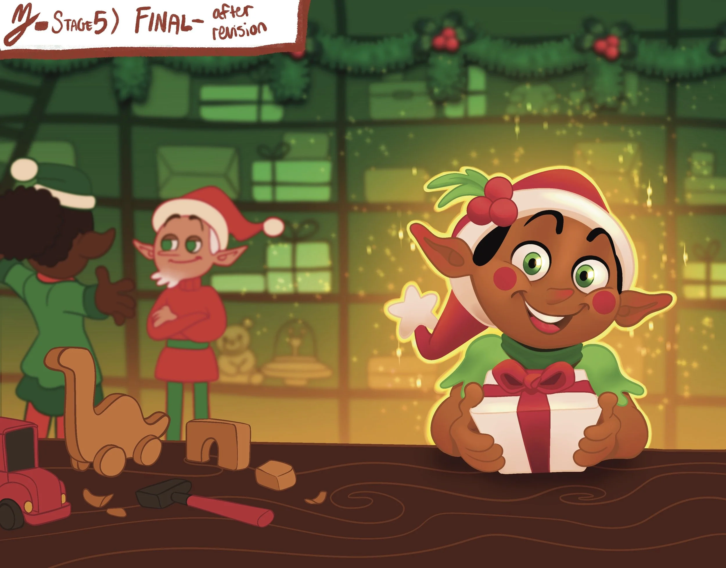 STAGE 5: Final - Revised. Not always needed, but in the case of this work, the client had decided the color palette needed to feel more strongly of "Christmas", so an adjustment was made. (I added a couple extra christmas-y elements, just for good measure.)